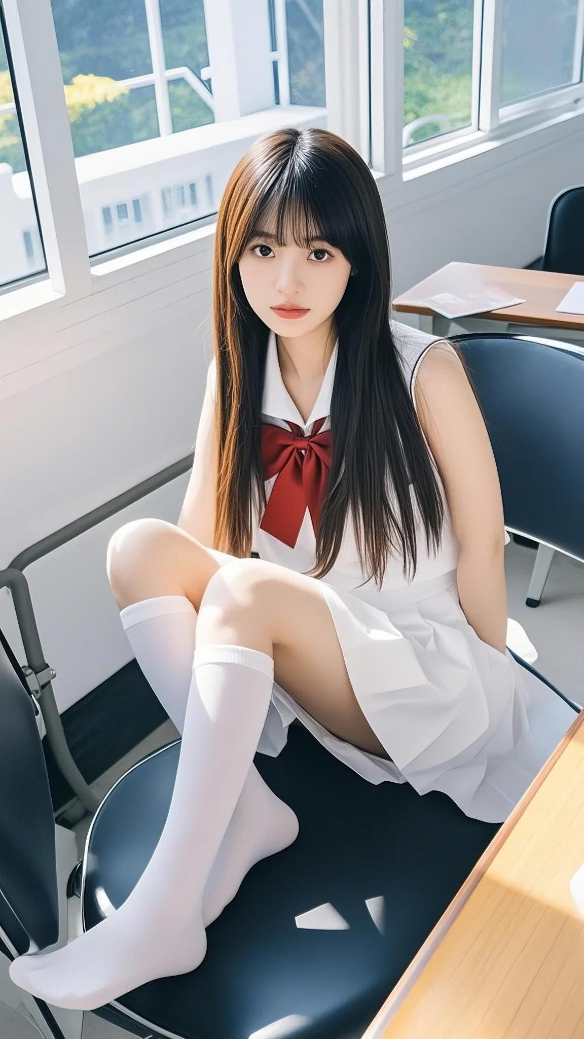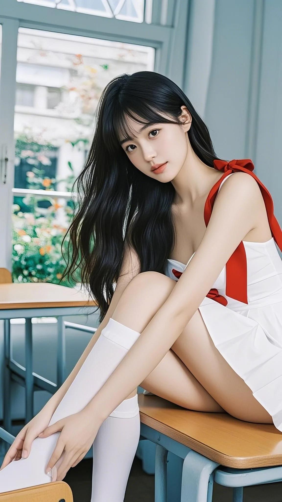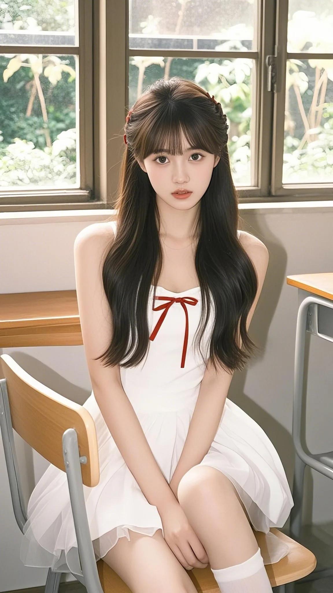 记忆里,校园教室中,她身着一袭白色的吊带短裙,裙上饰有明艳的红色蝴蝶结。她拥有一头修长靓丽的秀发,自然垂落,风轻轻的吹着,发丝随风飘舞,撩动少年的心。