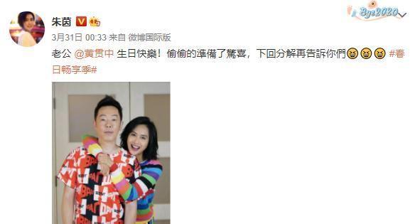 3月31日,朱茵发微博为黄贯中庆生,而且偷偷准备了京喜,下次再告诉粉丝,让众网友一阵的猜测。
