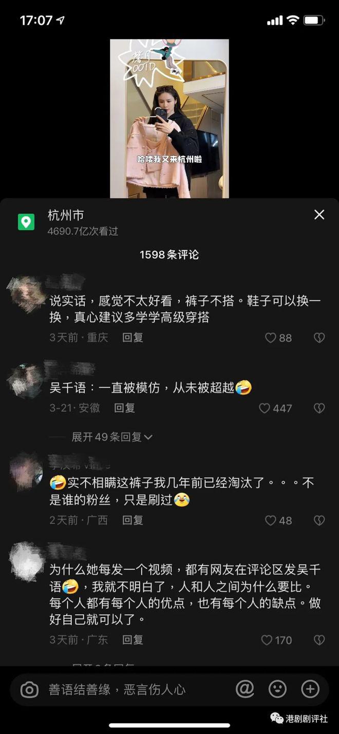 然而,Carina 分享了多个穿衣搭配却没有得到网民的欣赏,更被吐槽她的穿着品味。网民留言表示:「你还是去学学穿搭吧」、「我以为裤子就够土了,直到你拿出蝴蝶结全钻包」、「没有最土,只有 ...」「真是一言难尽」、「讲真啊,鞋子袜子吓到我」,亦有不少网民拿她与林峯旧爱吴千语比较,直指吴千语是时尚达人,衣着搭配感觉更高级更好看。