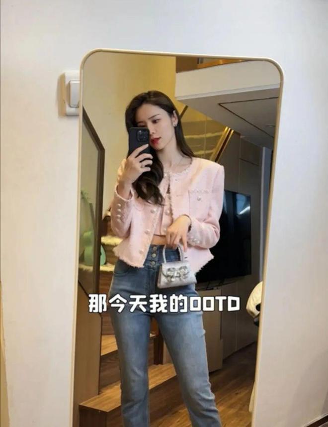 Carina 于第一条片中就拍下了她到杭州好友家中玩时的衣着打扮,写上:「今日的 OOTD 是春天的氛围」。她选择了一件粉红色的小香风外套加同色内搭上衣,再衬一条七分牛仔裤,配戴一个银色闪钻蝴蝶结手袋,一身 bling bling 名媛感觉,但最离奇是衬了白袜和白色波鞋,显得格格不入,令到整体感觉好奇怪。
