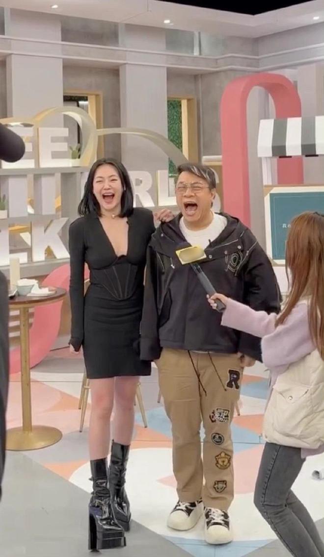 照片中,小 s 身穿黑色紧身裙,蔡康永则是休闲打扮,穿着卡其色长裤,二人同时开怀大笑感情很好。