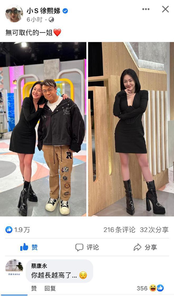 网易娱乐 12 月 23 日报道 23 日,小 s 在个人社交平台分享了与蔡康永的合影,并配文:" 无可取代的一姐。" 蔡康永则在帖子下评论:" 你越长越高了。"
