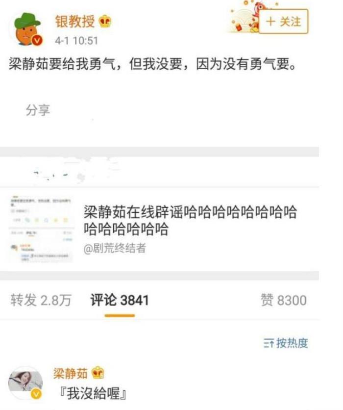 原来,昨天愚人节的时候,有位网络知名段子博主发了一个关于梁静茹《勇气》这首歌的段子,说“梁静茹要给我勇气,但我没要,因为没有勇气要”。结果梁静茹本人亲自回复了四个字说“我没给喔”。这个亲自打假辟谣的回复也让网友们炸锅了。纷纷同情起开玩笑被梁静茹本人抓包的博主本人了。