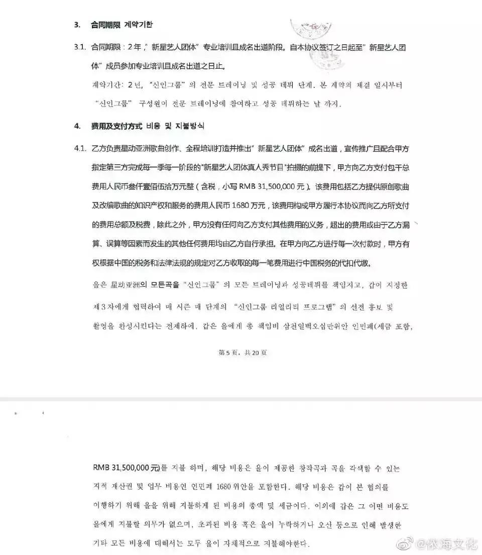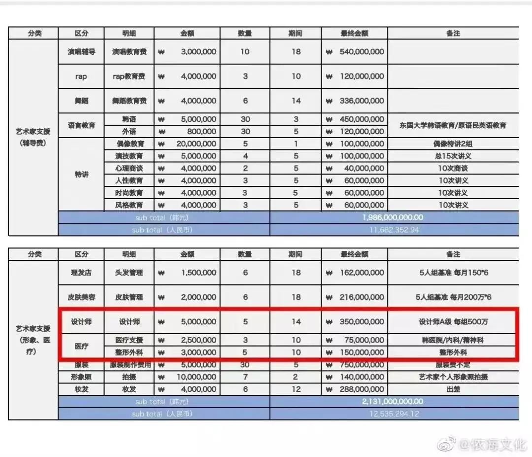11月21日,蔡徐坤前东家依海文化晒出为蔡徐坤等练习生签订的培训合同,以及部分训练、整形费用明细。
