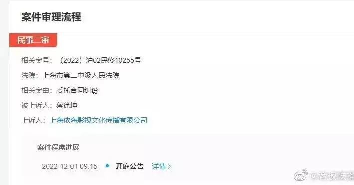 近日,蔡徐坤前经纪公司上海依海影视文化传播有限公司与蔡徐坤委托合同纠纷新增二审开庭公告,上诉人为上海依海影视文化传播有限公司,案件将于12月1日在上海市第二中级人民法院开庭。