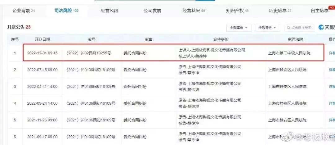 信息显示,蔡徐坤2017年曾因委托合同纠纷起诉上海依海影视文化传播有限公司,上海依海影视文化传播有限公司上诉后又撤诉。2021年,上海依海影视文化传播有限公司再因委托合同纠纷起诉蔡徐坤,该案已多次开庭。