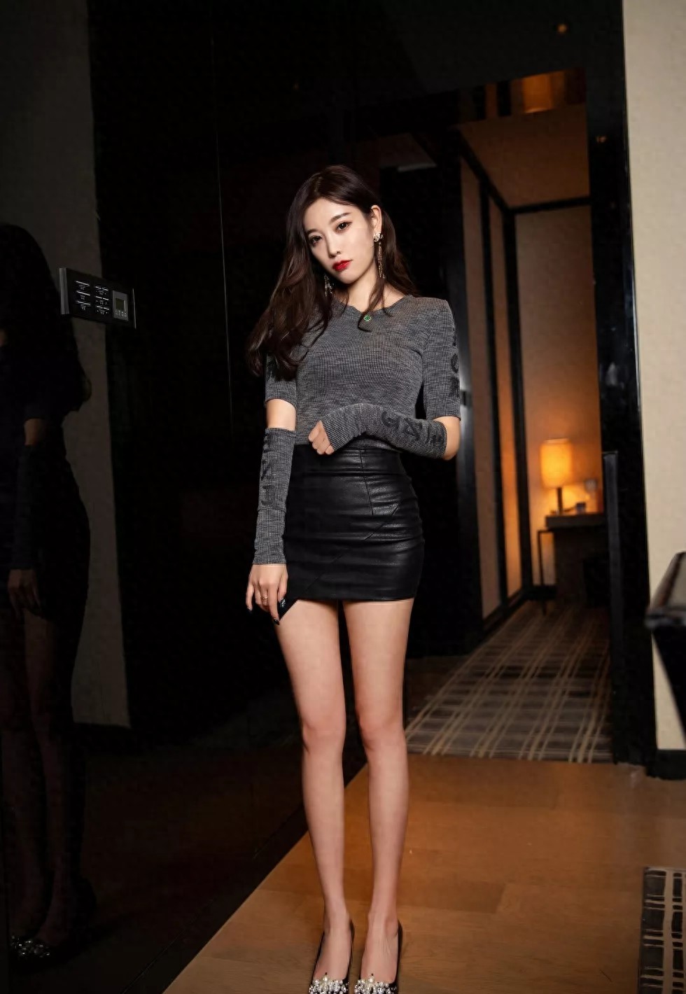 皮质短裙则是整个造型的亮点,为整体增添了一抹不羁与个性。皮质材质具有独特的质感和光泽度,使得短裙看起来更加高级有质感。短裙的长度恰到好处,既能展现出杨晨晨修长的腿部线条,又不会显得过于暴露。同时,短裙的设计也十分考究,与上衣的简约风格相得益彰,营造出一种既时尚又优雅的氛围。