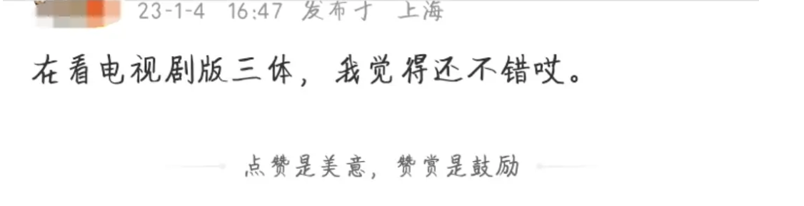 第三点,有部分网友透露,《三体》已经举行了业内看片,评价是“还不错”、“蛮尊重原著”、“前两集几乎就是照着原著拍的”,如果真是这样,确实值得期待。