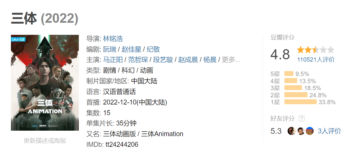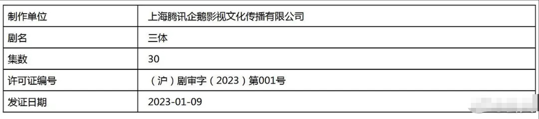 同时曝光的还有一张过审表格,上面显示制作单位为上海腾讯企鹅影视文化传播有限公司,剧名《三体》,集数为30集,而许可证号则为2025年第001号,发证日期2025年1月9日。我们看到消息后,和导演杨磊联系,得到了确定的答复,《三体》确实过审,并即将上线播出,豆瓣平台也更新了这部剧的播出日期,显示为2025年1月15日。