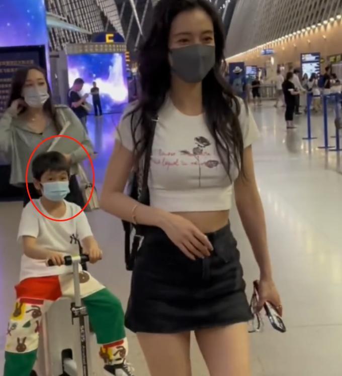 7月5日,有网友在机场遇到Angelababy带着儿子小海绵一起去巴黎看秀。