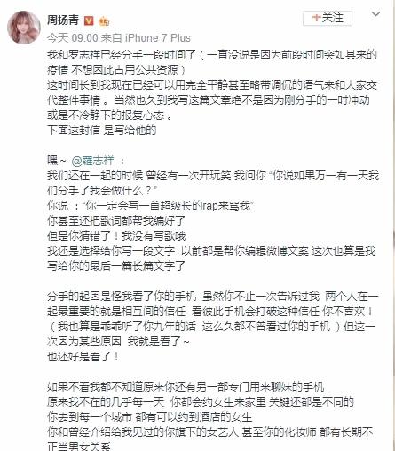 自从2020年4月周扬青在社交平台以一篇长文宣告了和罗志祥九年的恋情结束,并且还曝光了罗志祥在两人恋爱期间多次出轨。