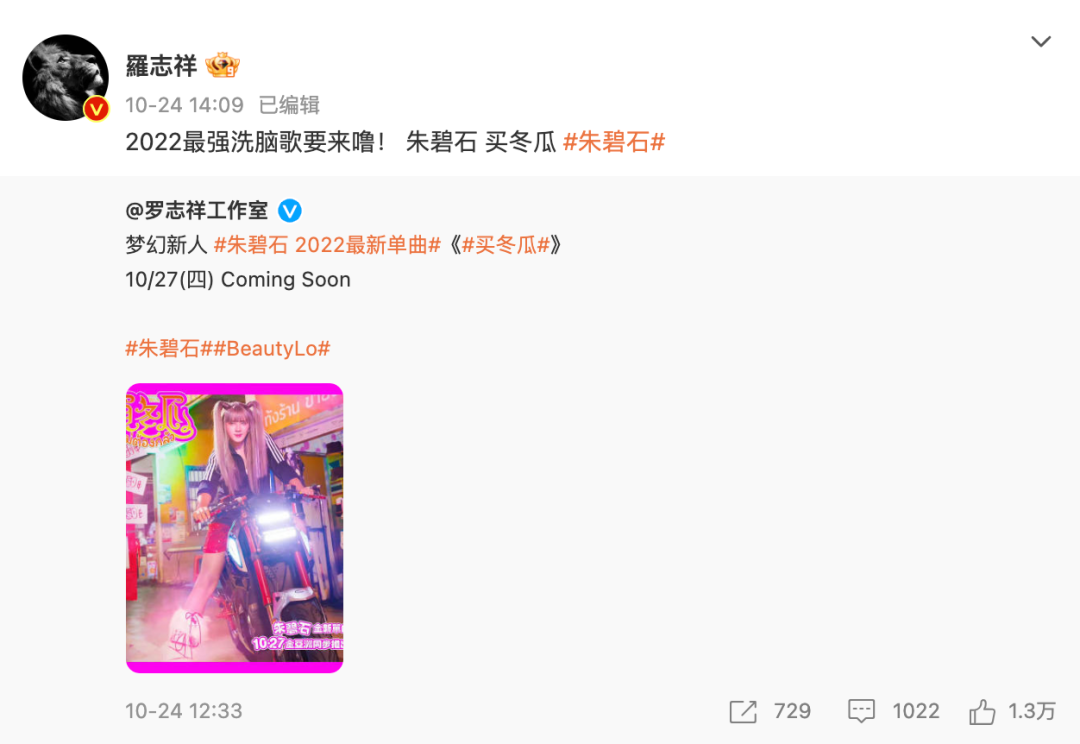 罗志祥没有放弃,他开始变换形象,利用了他在大陆爆火综艺《极限挑战》中饰演的“朱碧石”一角进行复出,他在举办完演唱会的几天后,高调的在国内社交平台利用“朱碧石”发布了自己的单曲《买冬瓜》,并且紧接着,“罗志祥将以朱碧石的身份发单曲”登上热搜,这种别出心裁的复出确实是很快将许久未曝光的罗志祥推向了人们的视野。