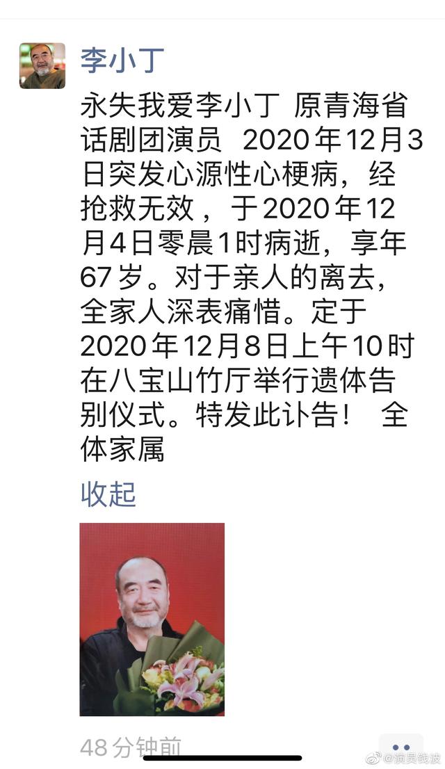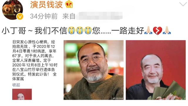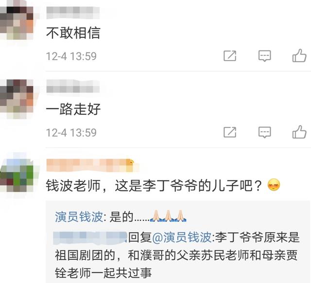 12月4日,演员钱波在社交平台晒照并发文哀悼李丁儿子李小丁,配文"小丁哥,我们不信,您一路走好"。