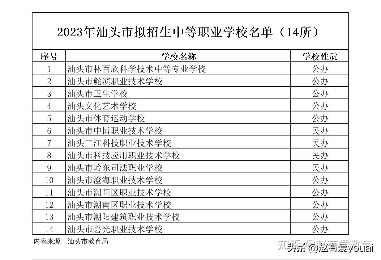 汕头市2023年中等职业学校(中职)招生学校总共有14所,其中: