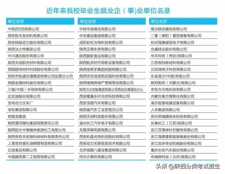 学校重视学生就业工作,构建起了遍布全国的毕业生就业网络。定期举办的校内“供需见面,双向选择”就业洽谈会,为毕业生就业搭建便捷平台。依凭厚实的行业基础,学校与国内600余家大中型企事业单位建立了长期、稳固的用人合作关系,牵头成立了校企协同育人战略联盟,设立企业冠名订单班达302个,毕业生就业面向机械制造、航天航空、石油化工、纺织服装等多个行业和领域,人才输出立足陕西覆盖全国29个省市。毕业生以其优良的素质、扎实的专业技术基础和娴熟的职业岗位技能深受用人单位的欢迎和好评,近三年毕业生去向落实率稳定保持在96%以上,位居全省同类院校前列,毕业生在央企和行业龙头企业等国家骨干企业就业比例超过60%,24名优秀毕业生入职清华大学、浙江大学、北京航空航天大学等知名高校,先后涌现出五一劳动奖章获得者、中国中铁青年岗位能手标兵、梦桃式最美职工、陕西省青年突击手、陕西最美青工、陕西省技术能手等一大批新时代工匠。学校荣获“全国职业院校就业竞争力示范校”“中国职业教育就业百强”等荣誉称号,连续多年被评为陕西省“高等学校毕业生就业工作先进集体”。