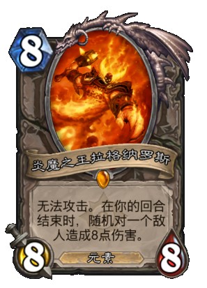 炎魔之王的强度比上一期讲的风领主不知高了几个台阶,经历的诸多版本依然强力,因为入场的回合就能直接造成8点伤害,对手如果不在接下来的回合内解决掉,那就是16点伤害。即使被沉默,依然彪悍。他的存在不得不逼得对手交出各种手段和随从护脸(还不一定护得住)。特别在游戏后期,当你可以顺利清场并不在对方斩杀线内的情况下,放下拉格纳罗斯的冲击性是非常巨大的。因此可以在任何中慢速卡组中加入这张卡牌。但使用时务必警惕牧师的精神控制,法师的变形术,萨满祭司的妖术,以及中立随从王牌猎人和希尔瓦娜斯·风行者。