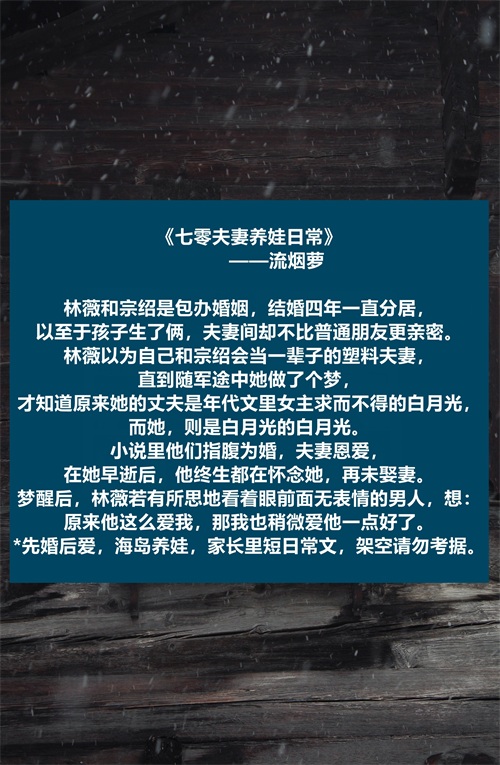 推语:随军文,女主与男主从娃娃亲到相亲到走入婚姻,因男主驻军,两人聚少离多,后来女主决定随军前往海岛,却梦见自己生活在一本书中,还不是主角,甚至连出场都需要别人回忆,因为她很早就去世了,书中丈夫会用一生来缅怀自己。女主开始正视夫妻关系,感情渐浓,也通过提前预知躲过了生死劫,结局HE。