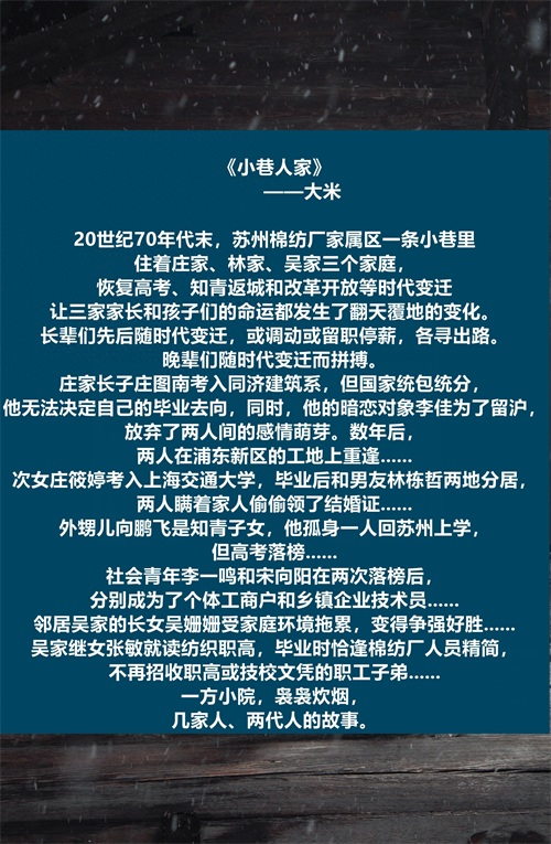 推语:非常好看的作品,从纺织厂大院的分房开始,讲述了两家人的成长故事。作者文笔很不凡,运用了比较强烈的对比手法,人物实际走向与出场时候的设定有很大的反转,但是人物勾勒很立体,没有绝对的好坏,非常真实而又幽默的描绘了上世纪普通人的生活,有摩擦,有碰撞,有激情,也有迷茫,强烈推荐!