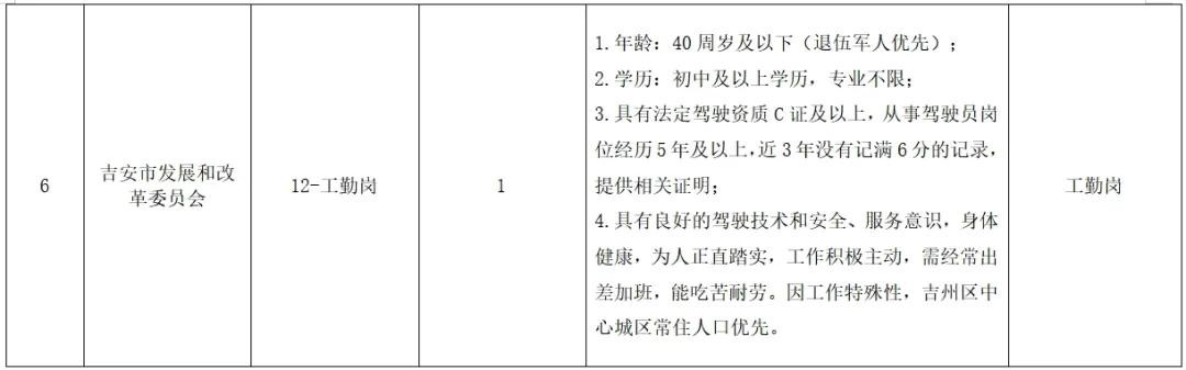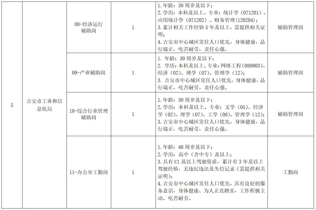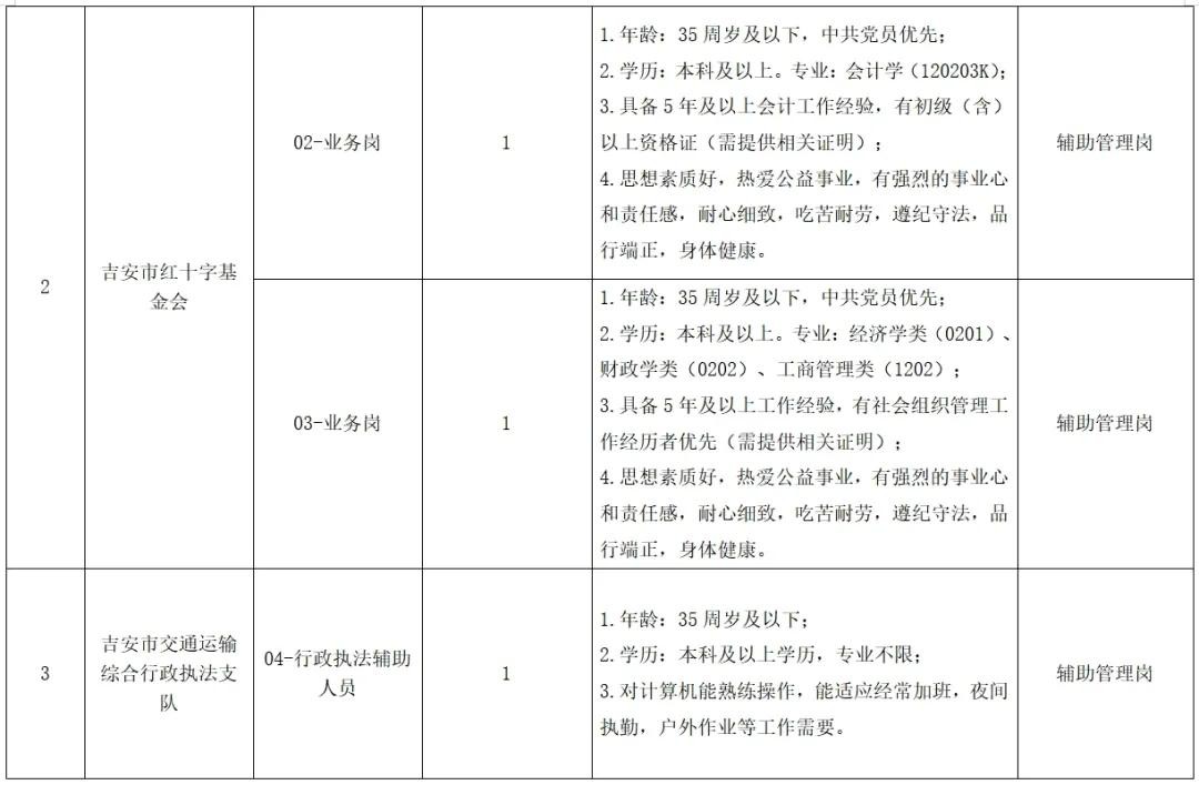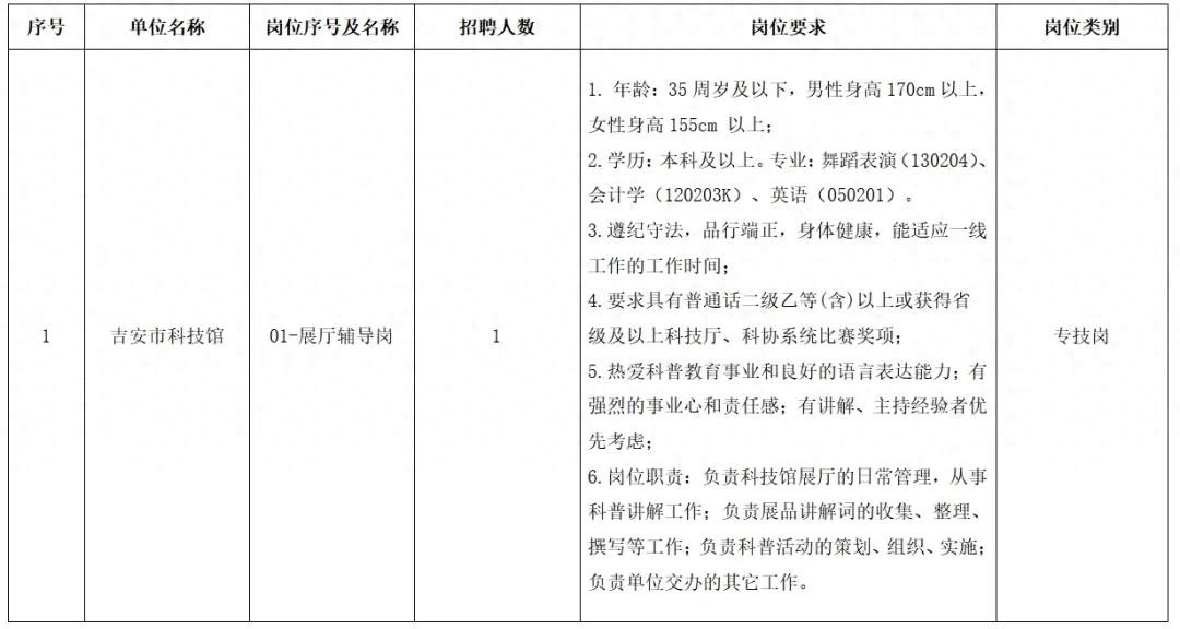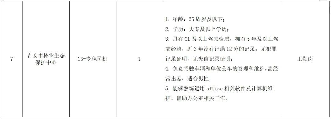 根据吉安市科技馆、吉安市红十字基金会、吉安市交通运输综合行政执法支队、中共吉安市委组织部、吉安市工业和信息化局、吉安市发展和改革委员会、吉安市林业生态保护中心用工需求,需招聘工作人员13名(具体招聘岗位信息详见附表),现将有关招聘要求公告如下: