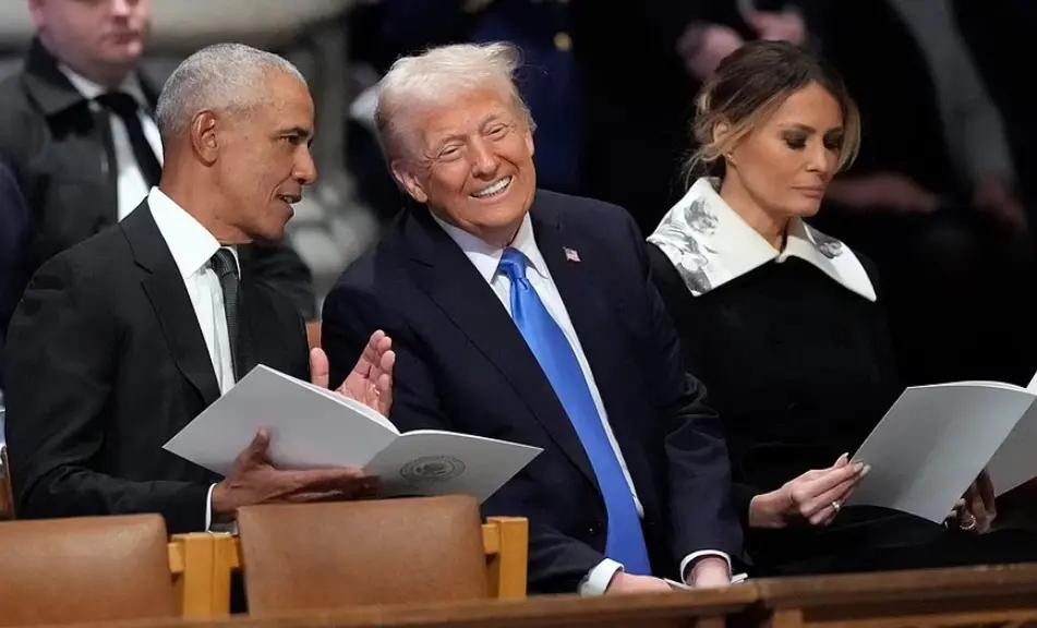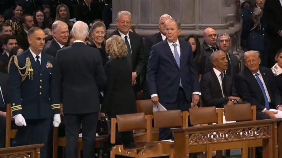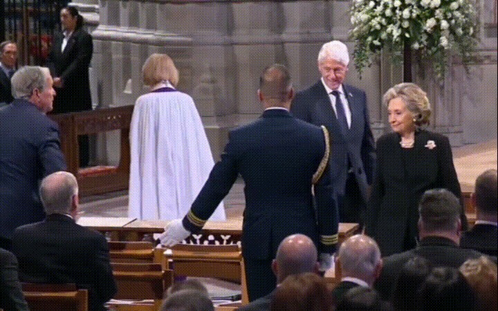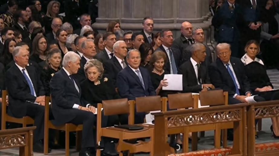 卡特葬礼上!布什先站起来迎接希拉里,特朗普和奥巴马“咬耳朵”