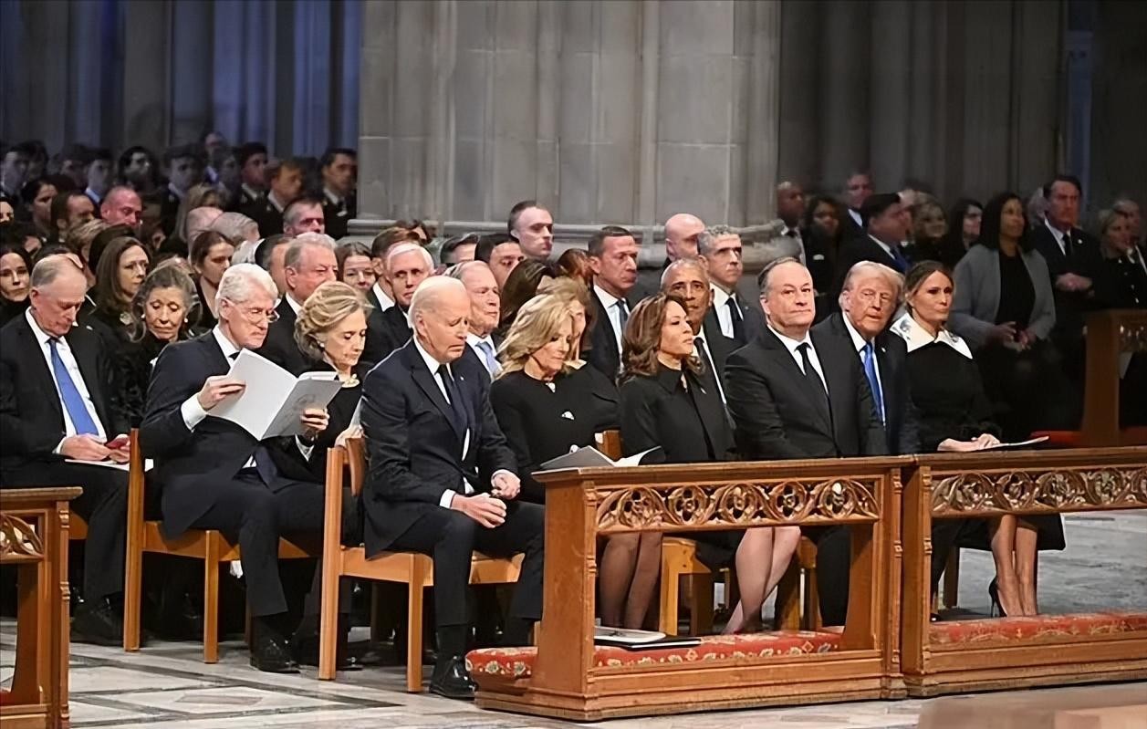 卡特葬礼当天,美国总统拜登,以及四位前总统布林顿、小布什、奥巴马和特朗普都出席悼念。