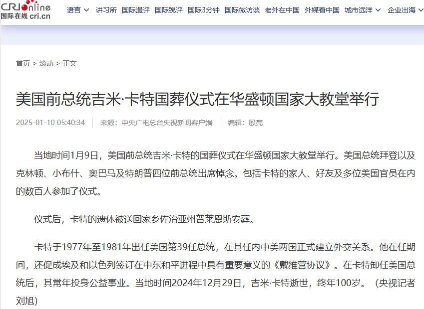 中央广电总台央视新闻2025-01-10 ,美国前总统吉米·卡特国葬仪式在华盛顿国家大教堂举行