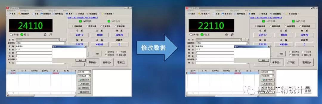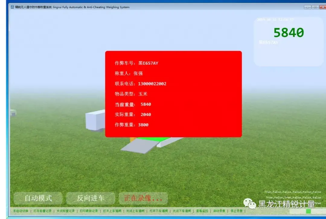 1. 软件弹出窗口并语音报警提示称重员,软件弹出窗口显示:车号、当前重量、实际重量、作弊重量,同时关闭道闸,车辆不能放行;