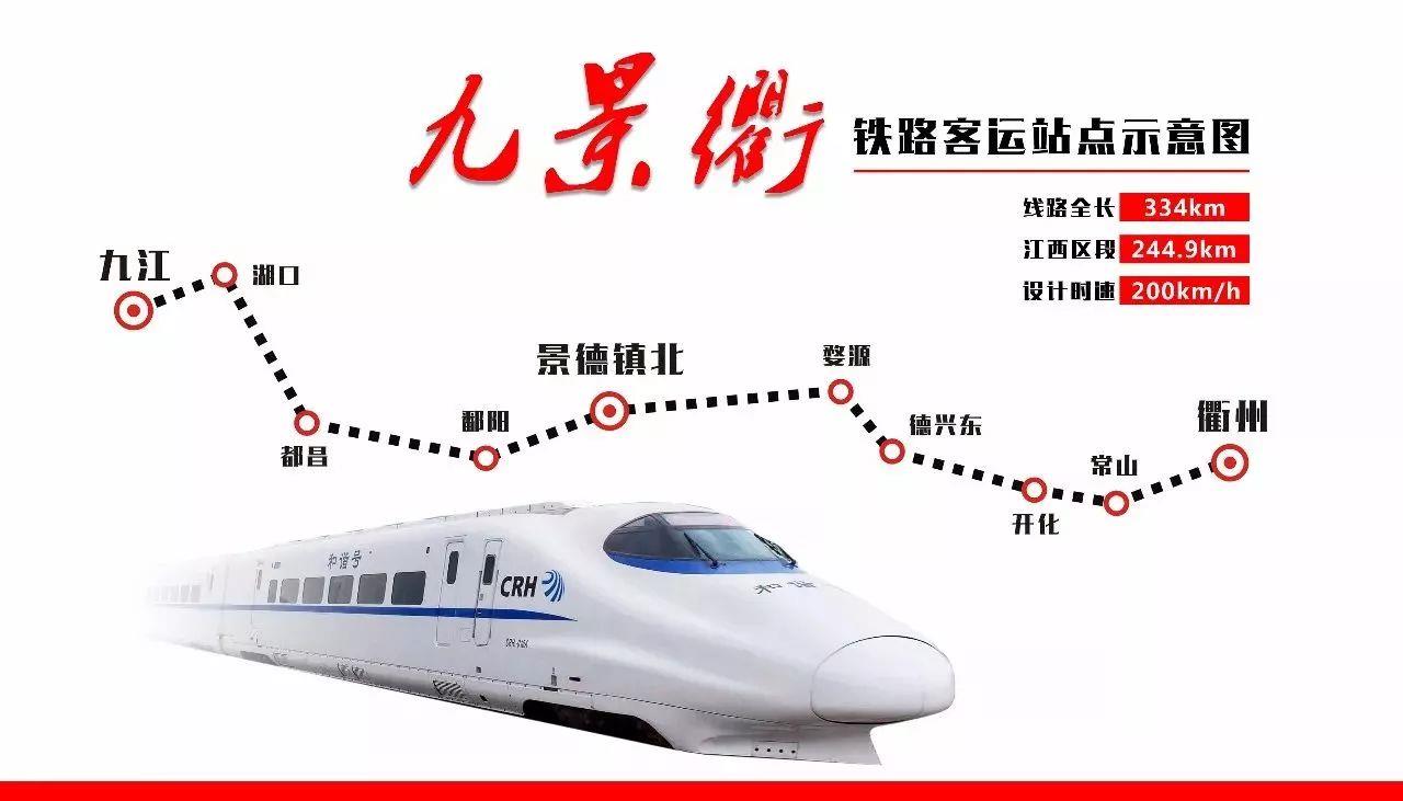 九江至景德镇至衢州铁路西起江西省九江市,往东经景德镇、婺源,浙江省常山,抵达衢州市,全长334公里,设九江、湖口、都昌、鄱阳、景德镇北、婺源、德兴东、开化、常山、衢州等10个车站,运营时速200公里。