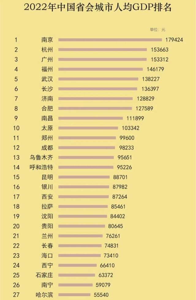 27个省会城市人均GDP:杭州力压广州,成都第12,西宁领先哈尔滨