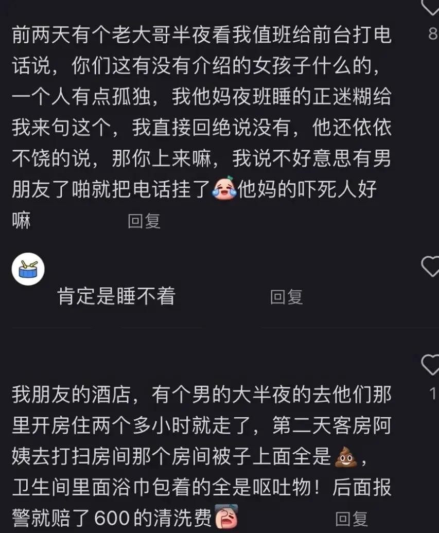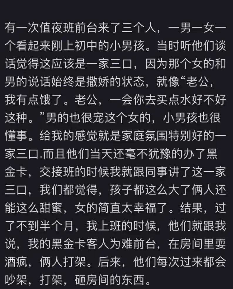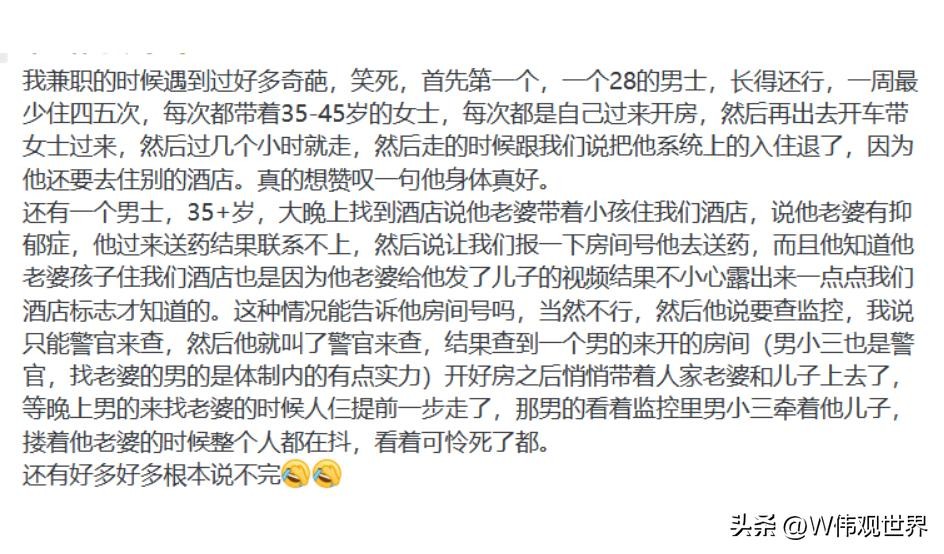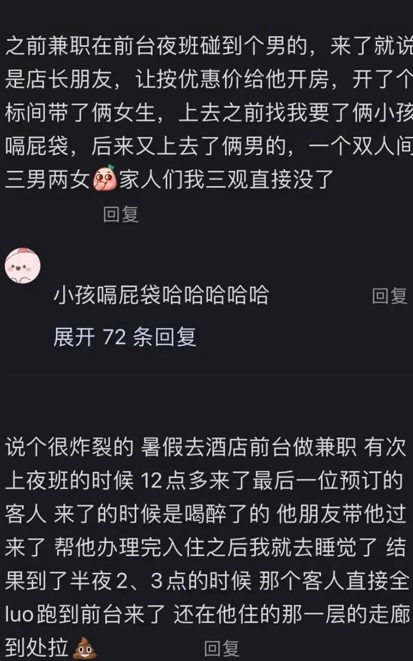 之前总是认为酒店前台工作轻松,环境又好,如果离家不是太远的话,不失为一个不错的工作选择。后来听人讲,女孩子最好不要去做酒店前台,酒店前台会遇到各种奇葩事儿,带着疑惑,搜索了一下,网友回复简直震碎了我的三观。