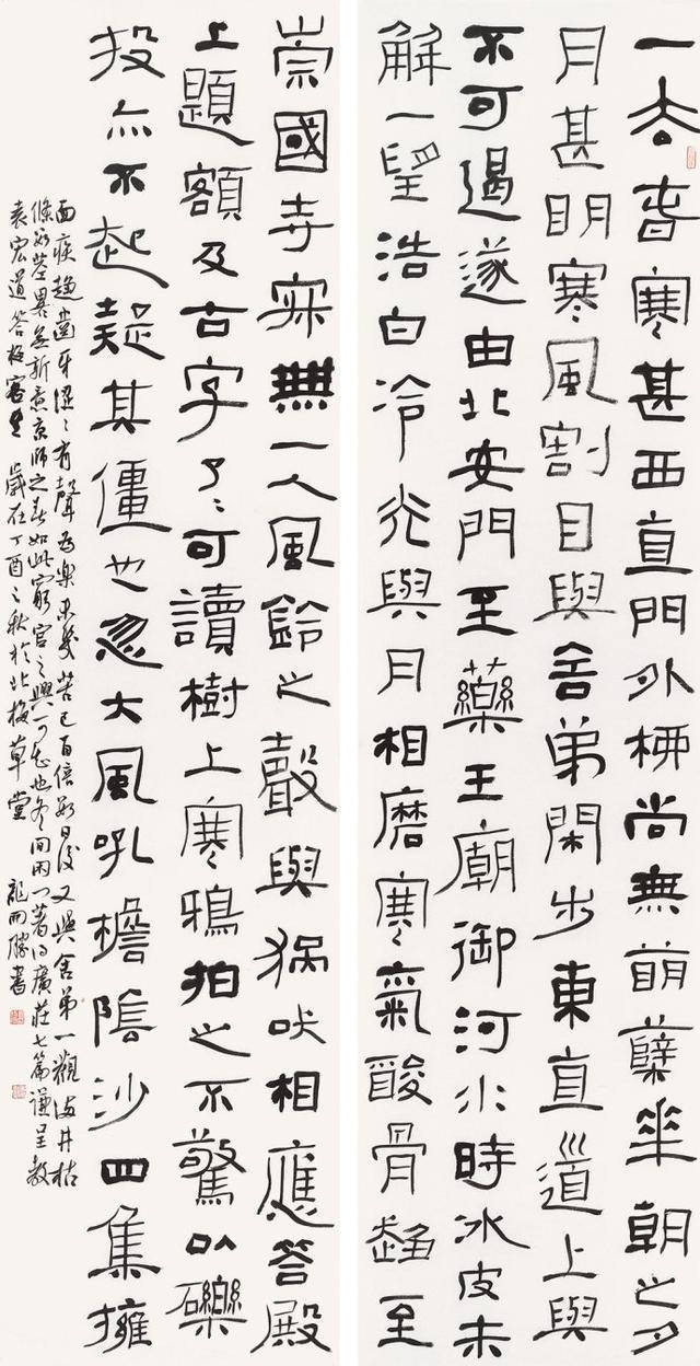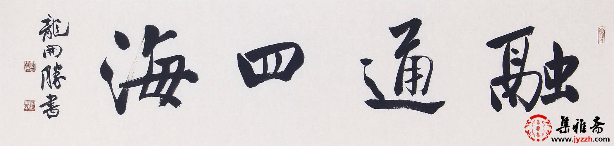 龙开胜行书《观海听涛》,运笔灵动自然,以中锋为核心,辅以侧锋变化,线条劲健且富有韵律。开合大气,提按间似现浪潮动感,结体疏密有致,字势连贯流畅。墨色浓淡交融,既显厚重苍润之质,又透灵动飘逸之韵,尽展行书笔法的洒脱与精妙布局。