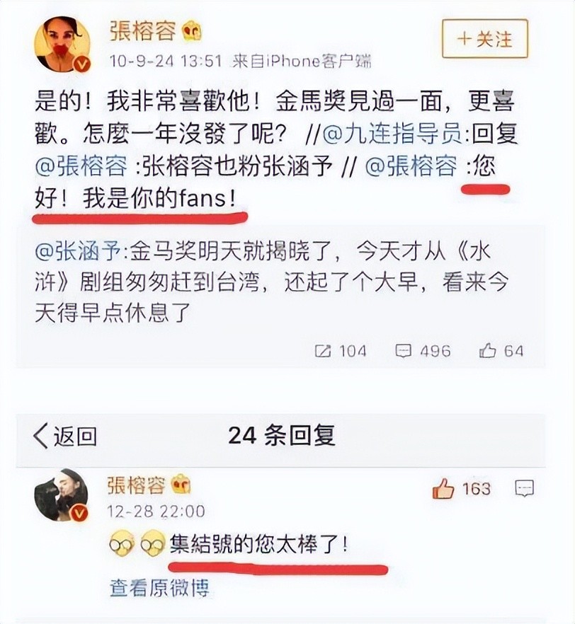 值得一提的是,张榕容还是张涵予的铁杆粉丝,有多铁杆呢,以至于以艺人身份当了张涵予粉丝后援会台湾副会长,早些年在她不多的社交媒体内容上只要有关于张涵予的动态必转,这个粉头是非常给力了,明星也追星,非常真实可爱。