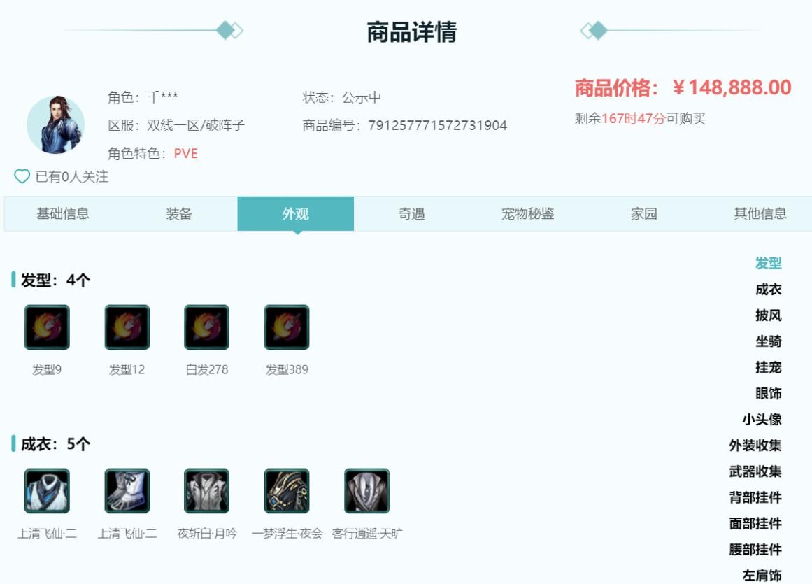 当然,资历和奇遇也是能提升一点号价的,如果你拥有13万资历,奇遇拥有阴阳两界、霸红尘等绝世奇遇,那号价也能提升一些,但并不算太多。号价的根本还是在那些“开车外观”上。