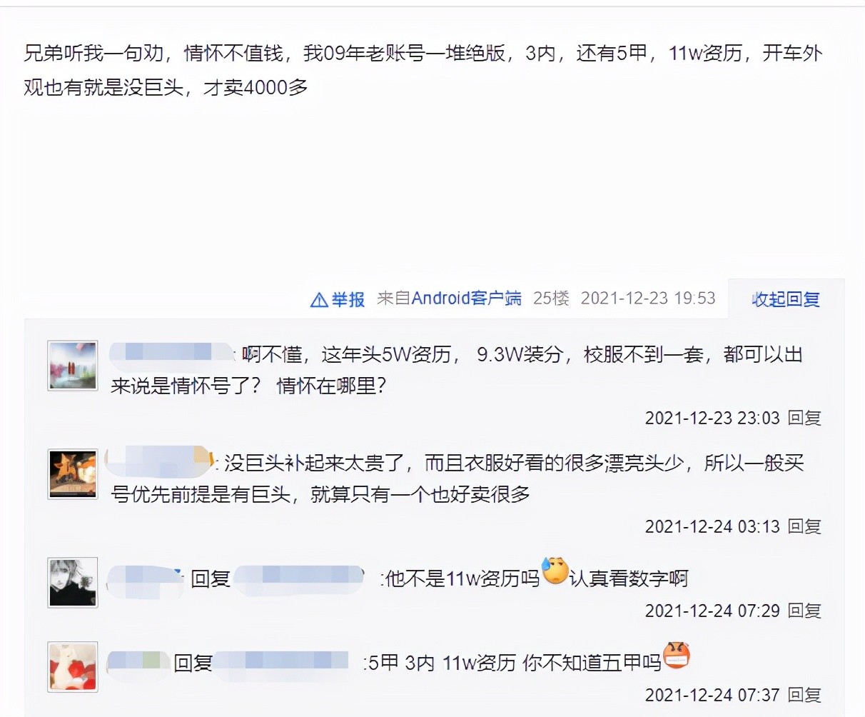 而情怀号呢?只要你接盘了,那就面临着两个选择,要么跟自己绑定,一直自己玩,不卖号。要么就是花大精力去把这个号打造起来。说实在的,这两个选择中的任何一个都无法支撑起“情怀号”十几万的价格。