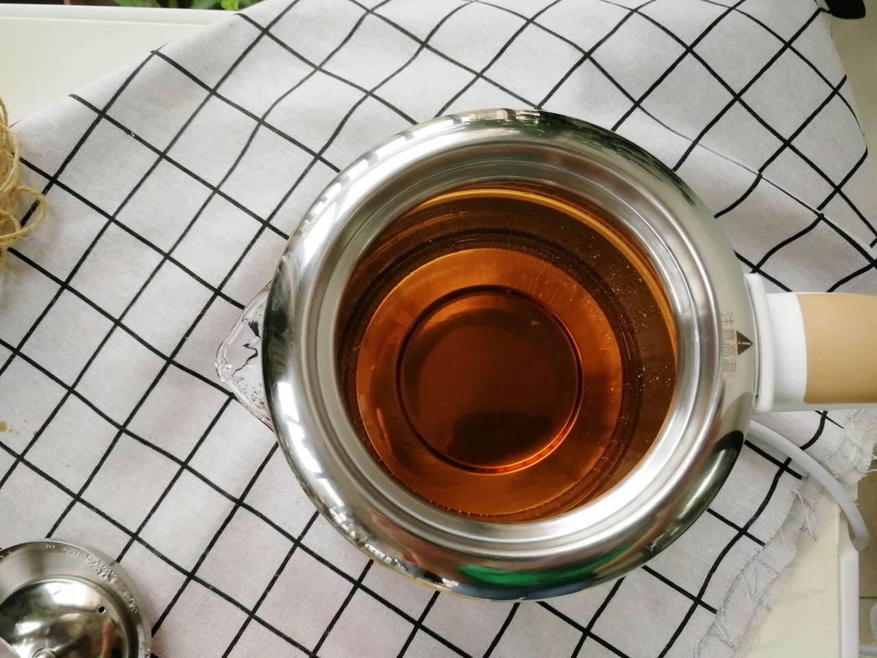 步骤4、茶煮好一个程序后,取出过滤器,茶叶也一并取出。此时茶汤已经煮到微微泛红。想喝茶味浓一些的可以多煮一会。