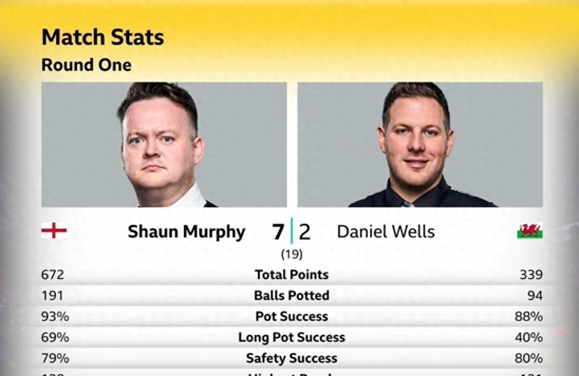 威尔斯第七局109分破百刚燃起希望,墨菲反手就是两局零封,安全球成功率79%的数据直接封死所有翻盘可能。
