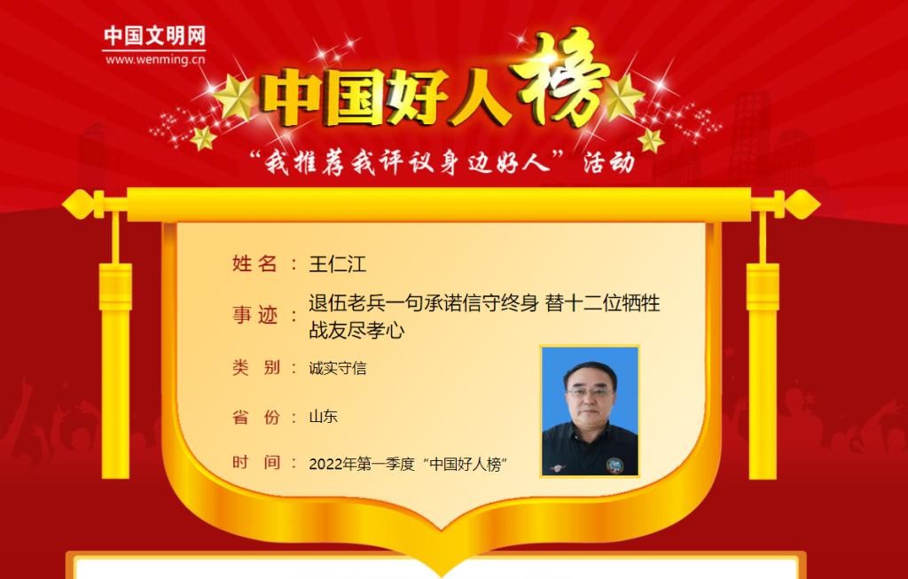 5月30日,中央文明办主办的2022年第一季度“中国好人榜”发布仪式暨全国道德模范与身边好人现场交流活动,通过“云”发布形式推出,青岛市崂山区王仁江荣登“诚实守信类”中国好人榜单。