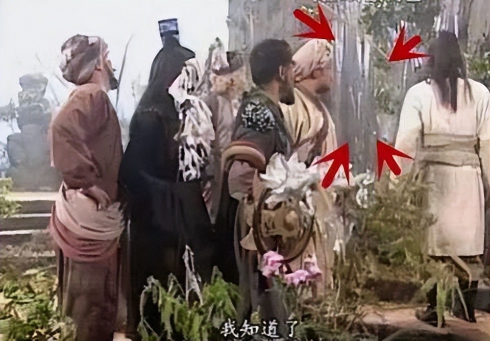 那么接下来的画面就是大型比惨现场,95版神雕由于资金有限,大部分场景都是在棚景中拍摄,假山假树先不说,在绝情谷中有这样一个场景