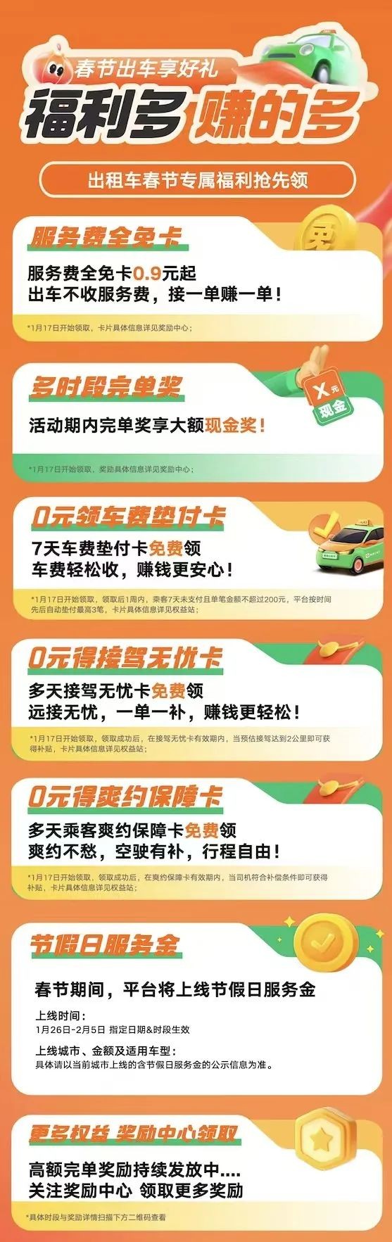 据悉,最早从1月17日开始,至2月7日(正月初十),滴滴出租车将在西安、重庆、太原、郑州、兰州、银川、芜湖、宝鸡等全国300多个城市,上线服务费全免卡、车费垫付卡、接驾无忧卡、峰期完单奖、节假日服务金等等多项权益!