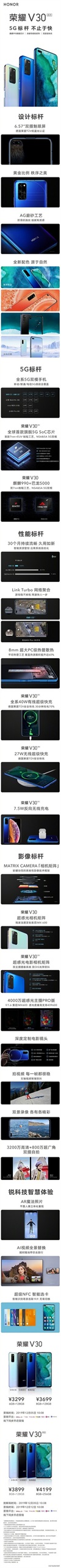 荣耀V30系列配置了6.57英寸双摄魅眼屏,分辨率为2400×1080,通过德国莱茵低蓝光认证,支持护眼电纸书,沉浸阅读,国家眼科工程中心五星认证,采用了侧边指纹识别,指纹识别和电源一体化设计,荣耀V30采用麒麟990处理器+巴龙5000,双7nm制程工艺,NSA&SA 5G双模。荣耀V30 Pro采用麒麟990 5G处理器,首款7nm+EUV制程工艺,NSA&SA 5G双模,8mm超大PC级热管散热,荣耀V30后置三摄像头采用定制版索尼IMX600传感器,4000万超感光主摄(1/1.7英寸感光元件,RYYB传感器,F/1.8光圈)+800万长焦+(3倍光学变焦,OIS光学防抖,F/2.4光圈)+800万超广角(F、2.4光圈)+蓝光对焦传感器。荣耀V30 Pro后置1200万独立电影镜头(五轴视频智慧防抖,16:9定制传感器,F/2.2光圈)+4000万超感光主摄PRO版(1/1.7英寸感光元件,RYYB传感器,OIS光学防抖,F/1.6光圈)+800万长焦(3倍光学变焦,OIS光学防抖,F/2.4光圈)+蓝光对焦传感器。