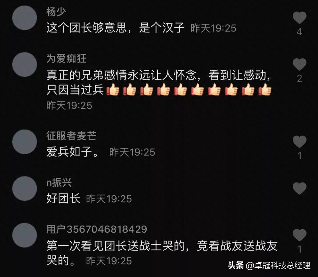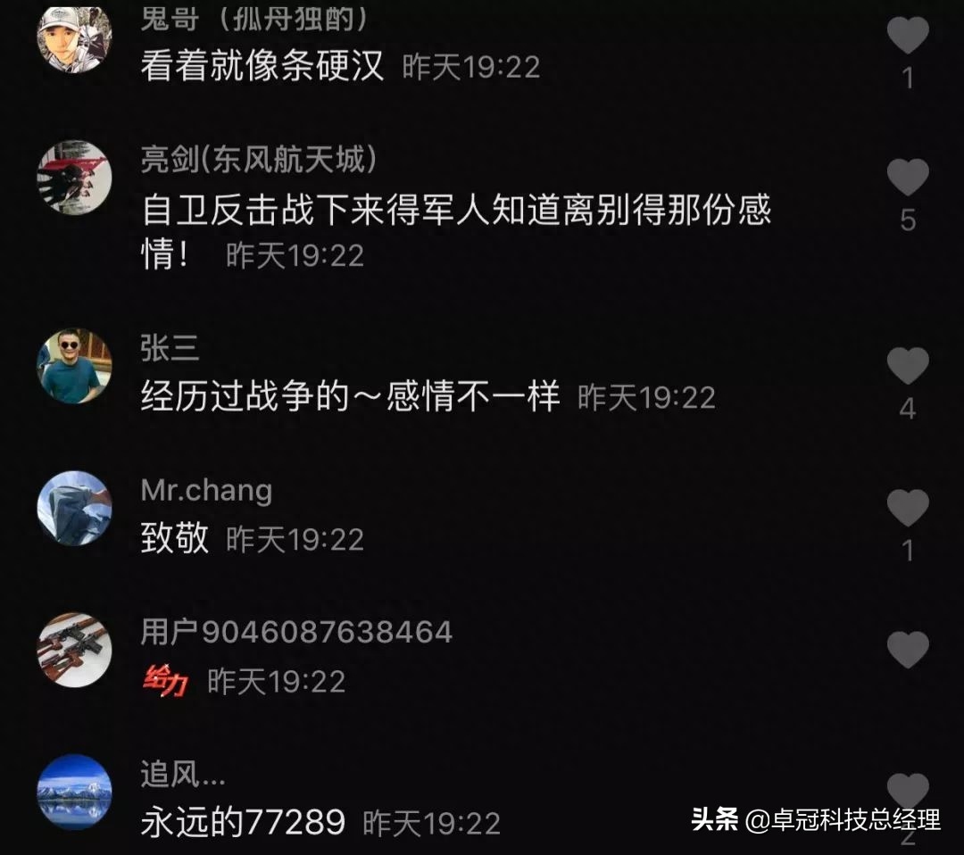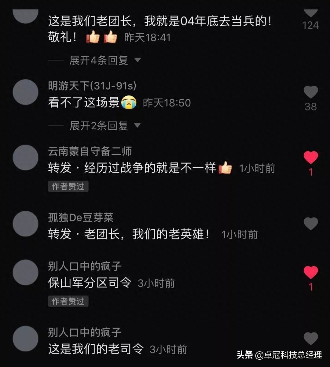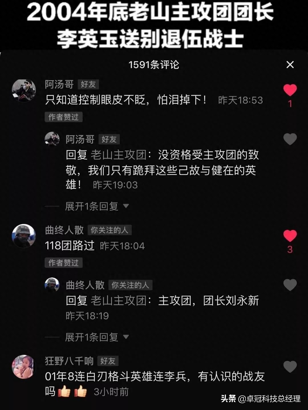 这是一段由本公号小编上传抖音的视频,短短30秒时间描述了2004年时任老山主攻团团长的李英玉团长在火车上送别退役战士的感动瞬间。这段视频在抖音上短短几个小时获得了38.1万的播放量、2.8万的点赞,1500余人的积极参与评论,在今日头条也得到近10万的播放量及1万多的点赞,可以说火遍了全网,让默默无闻的李团长得到了全国网友的一致好评,成为一位名符其实的“网红团长”。
