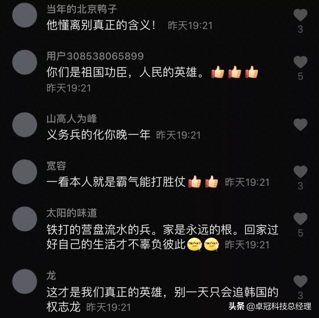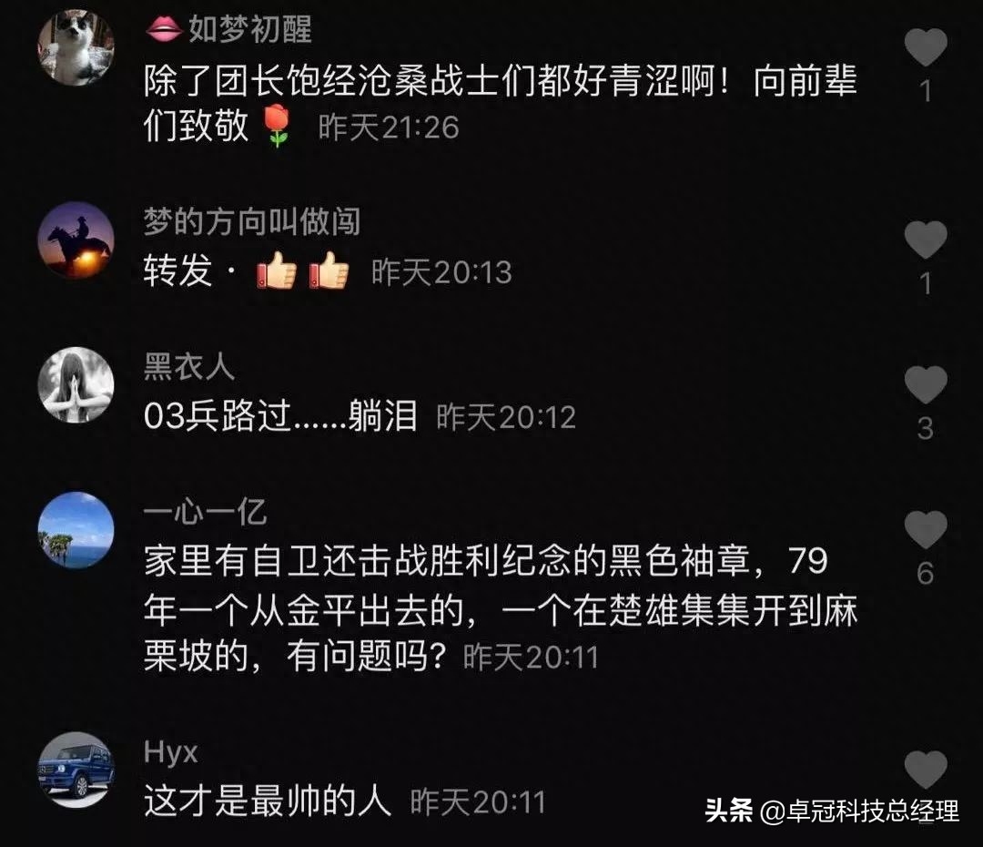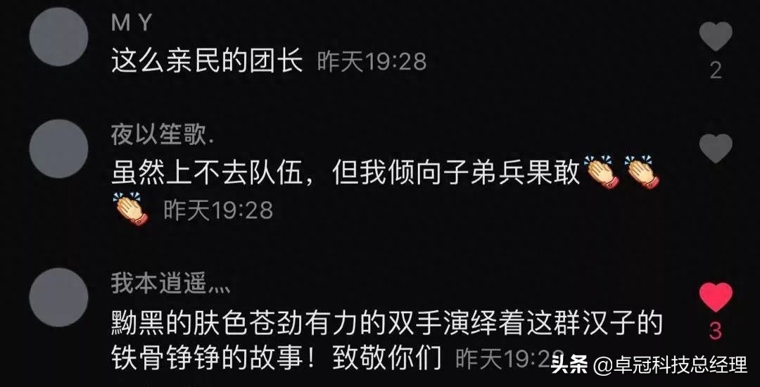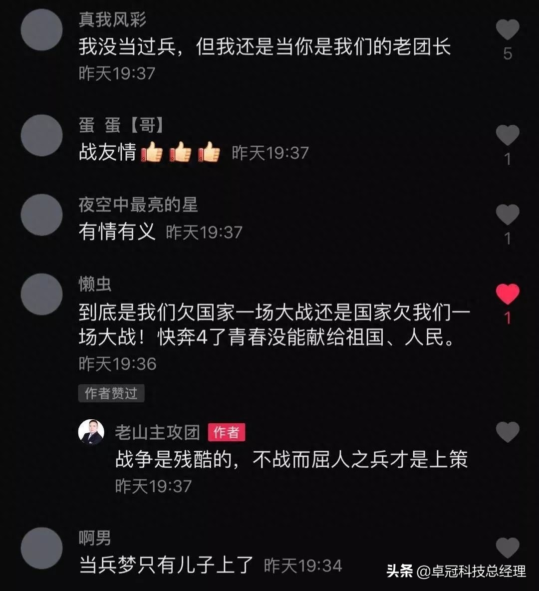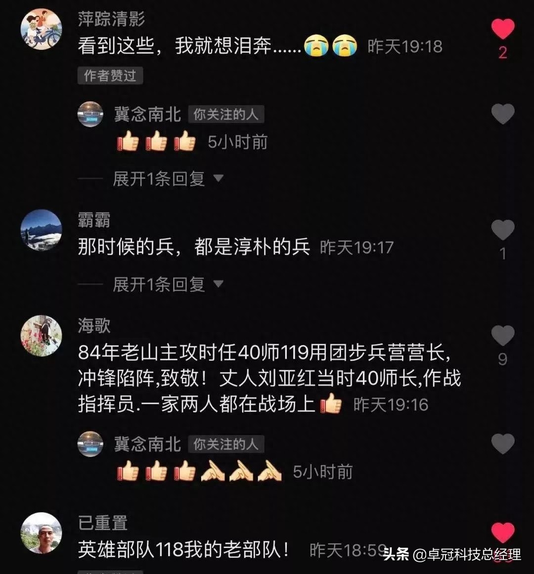 这是一段由本公号小编上传抖音的视频,短短30秒时间描述了2004年时任老山主攻团团长的李英玉团长在火车上送别退役战士的感动瞬间。这段视频在抖音上短短几个小时获得了38.1万的播放量、2.8万的点赞,1500余人的积极参与评论,在今日头条也得到近10万的播放量及1万多的点赞,可以说火遍了全网,让默默无闻的李团长得到了全国网友的一致好评,成为一位名符其实的“网红团长”。