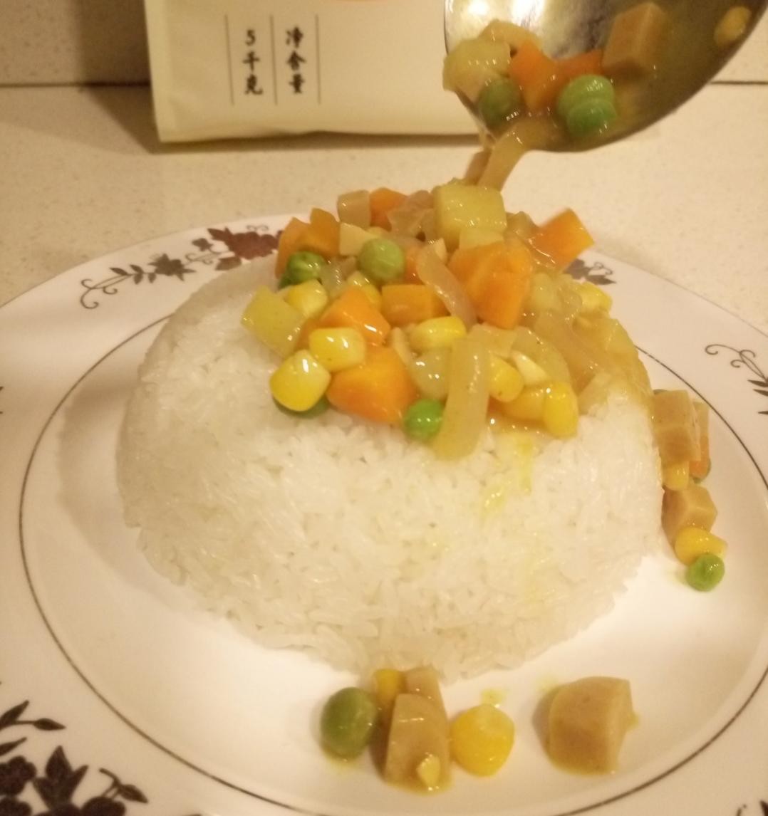 将做好的咖喱慢慢地倒入饭上就可以了。