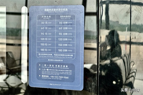 2024年4月20日,北京,北京首都国际机场T3航站楼候机厅里即将推出的商眠休息舱。休息价格表显示,旅客可在休息舱可休息从半小时到三小时不等,每分钟为1元钱。