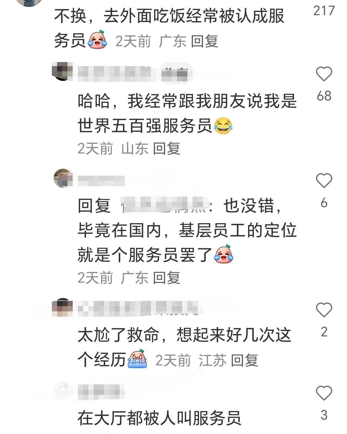 这位银行职员的经历并非个例,类似的误认事件时有发生。不久前,又有一名同行被人误认为服务员,而实际上他只是来吃饭的顾客。这次的误会更令人啼笑皆非,网友们纷纷调侃这些银行同事们是否下班后要换衣服,以免被人误认。