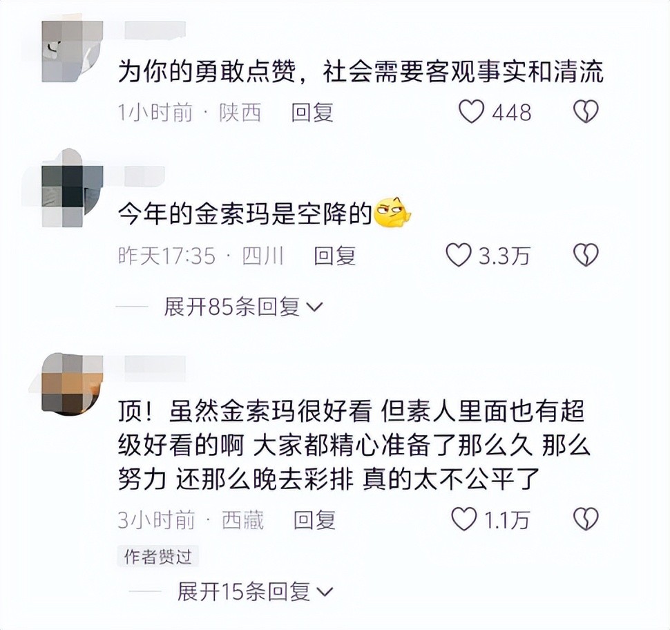 顶!虽然金索玛很好看但素人里面也有超级好看的啊大家都精心准备了那么久那么努力还那么晚去彩排真的太不公平了!