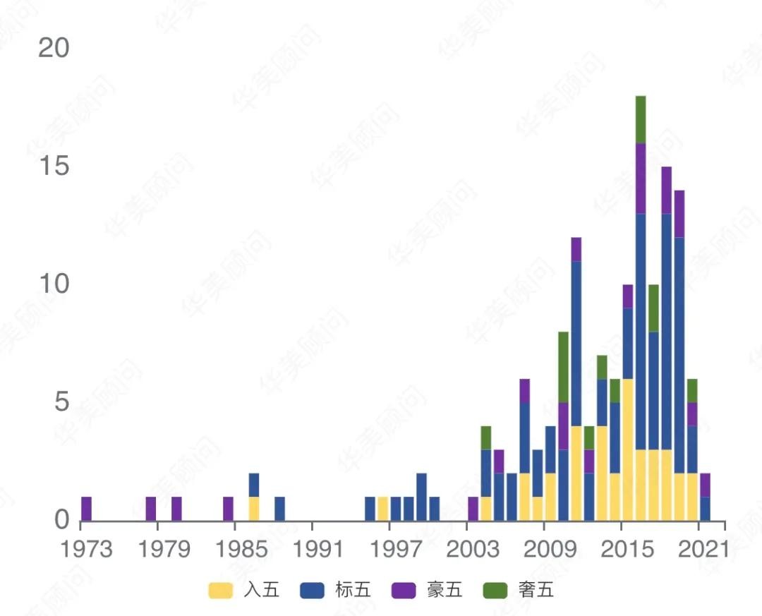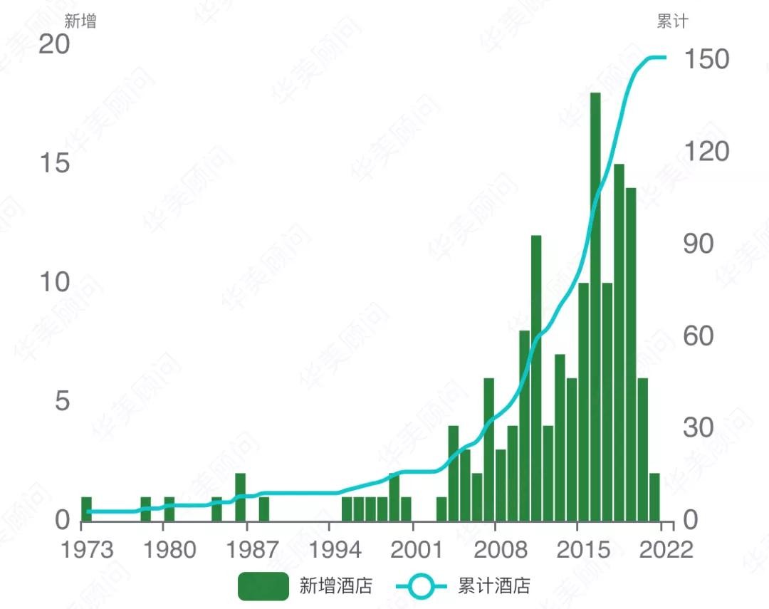 华美顾问集团华美数据展现了自1973年以来,杭州五星档次酒店发展变化情况 (数据来源于酒店集团官网、OTA平台公开数据,均只统计中国大陆地区已开业状态酒店)。