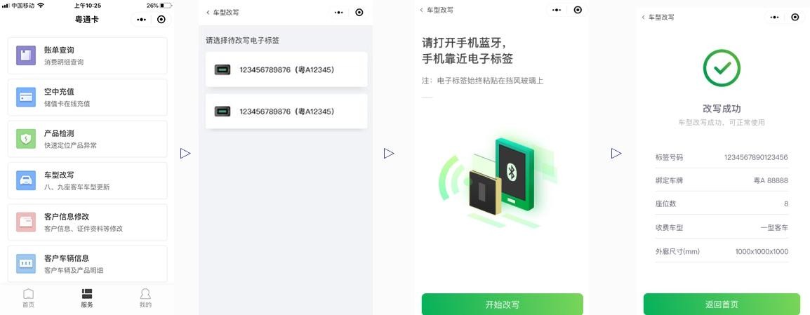 打开“粤通卡ETC”小程序,点击“服务”→“车型改写”→选择与车牌对应的电子标签号→打开手机蓝牙和标签蓝牙→“开始改写”→改写成功