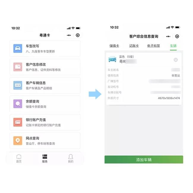 进入“粤通卡ETC”小程序,点击“服务”→“客户车辆信息”,即可获知爱车属于几座客车啦!