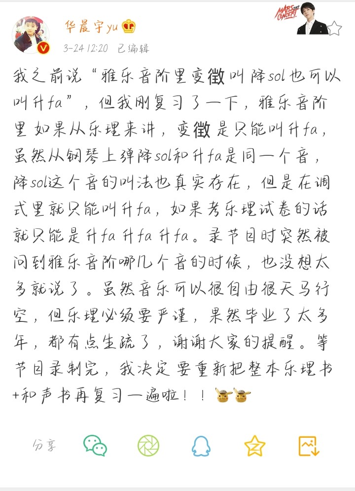 华晨宇今年第二次参加《歌手》,在本次《歌手》中带来许多原创歌曲,这些歌曲同样存在极大地争论,华晨宇也因多次取得第一名而颇受议论。最近一期歌手中,华晨宇在解释雅乐音阶时,引起了一波乐理争论,而华晨宇亲自回应,态度良好。